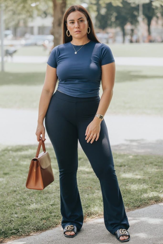 The deep navy top hugs just enough to feel intentional without screaming for attention, while the sleek black pants skim the hips and legs in that smooth, powerful way that instantly reads polished and expensive.