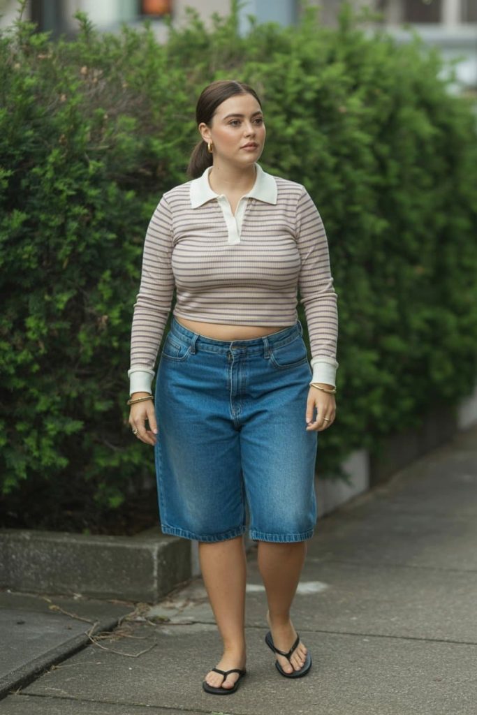The cropped striped polo keeps things playful but polished, hitting right at the waist to balance the longer shorts and show just enough skin to feel modern, while the relaxed denim fit gives that effortless “I just threw this on” energy.
