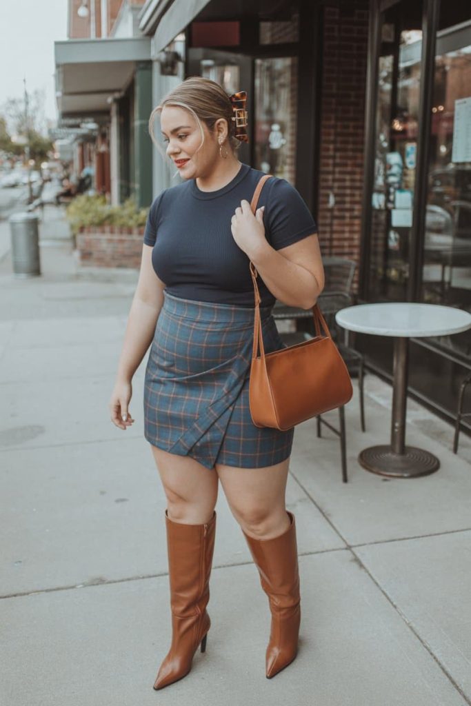 The fitted navy tee keeps things sleek and grounded, while the plaid wrap mini brings just enough texture and attitude to make the outfit feel styled, not safe.
