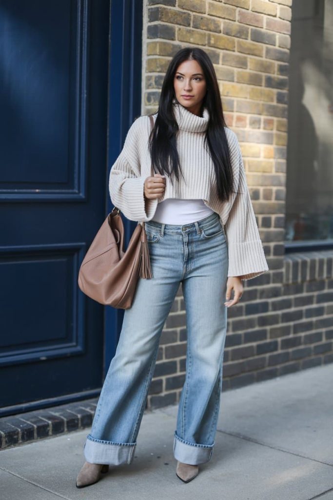 The cropped chunky turtleneck gives cozy-but-intentional vibes, while the wide-leg jeans keep the look relaxed and flattering.