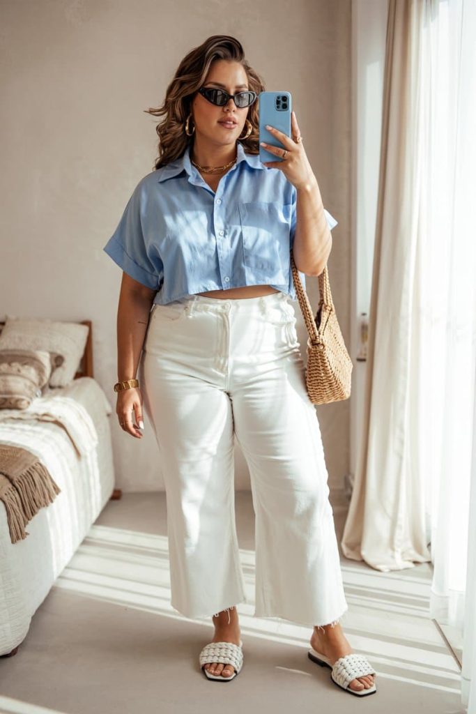 The cropped blue button-down keeps the look fresh and playful, while the white wide-leg jeans lighten everything up and let the outfit breathhe.