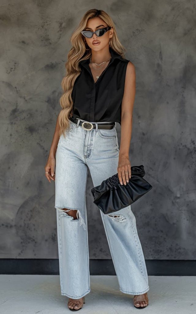Proof that minimal doesn’t mean boring. The sleeveless black button-down brings that quiet confidence energy, while the ripped wide-leg jeans keep things cool, relaxed, and just a little rebellious. The belt pulls the waist together, the clutch adds polish, and suddenly you look like someone who casually “just threw this on” and still stole the room.