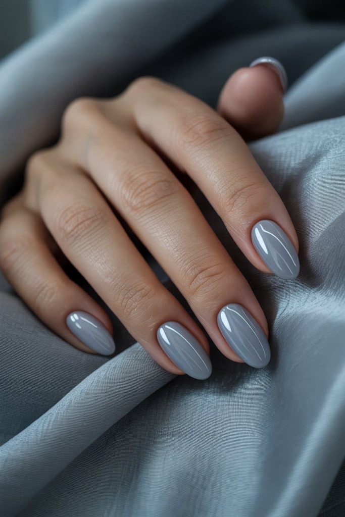 A cool, slate-gray polish coats the nails in a smooth, glassy finish that feels modern, intentional, and impossibly chic.