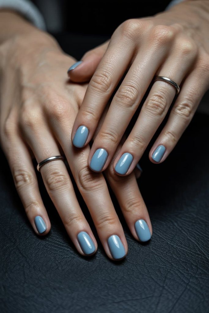 A muted blue-gray polish coats each nail in a smooth, glossy finish that feels calm, confident, and completely intentional.