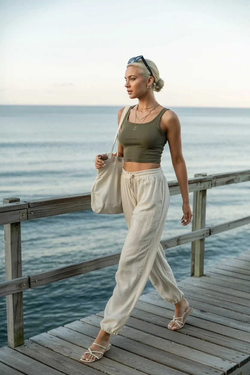 This is the outfit for the girl who knows exactly where the light hits. A fitted olive green crop tank paired with creamy jogger-style linen pants is the ultimate elevated beach walk combo. The strappy white sandals keep it minimal, the layered gold jewelry adds polish, and the canvas tote pulls everything together like a Pinterest board IRL. Whether she’s heading to a beachside dinner or just out for a peaceful walk, this look is effortless, clean, and totally put-together — without trying too hard.