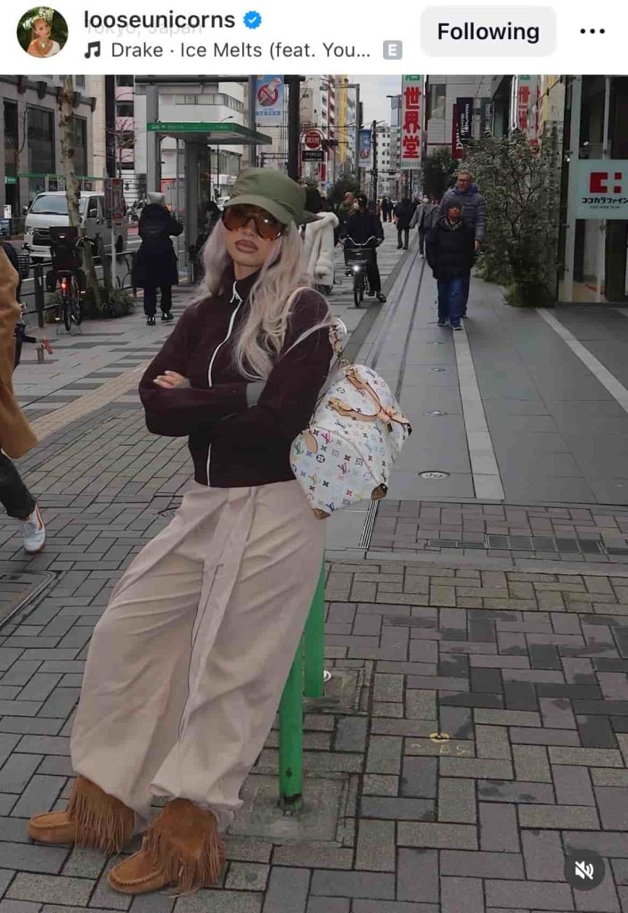 The zip-up is clean, fitted, and lowkey sporty, but then she hits you with those flowy trousers and suddenly we’re in effortless cool-girl territory. And the fringe boots??