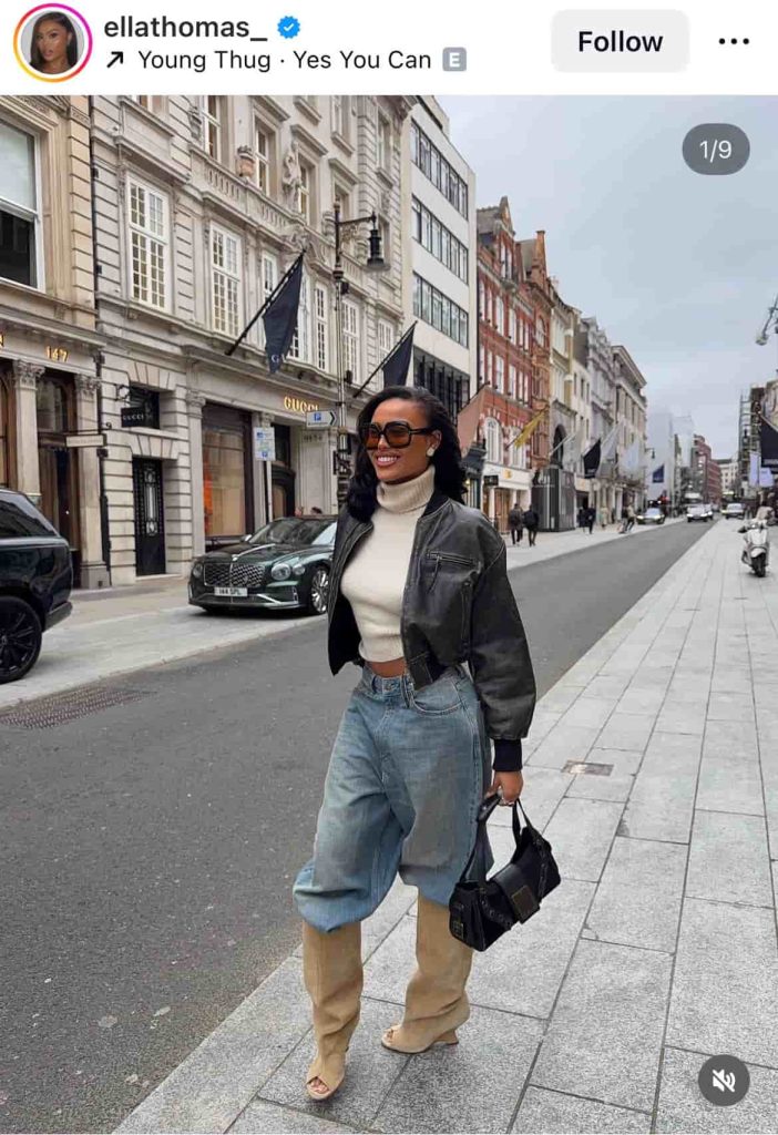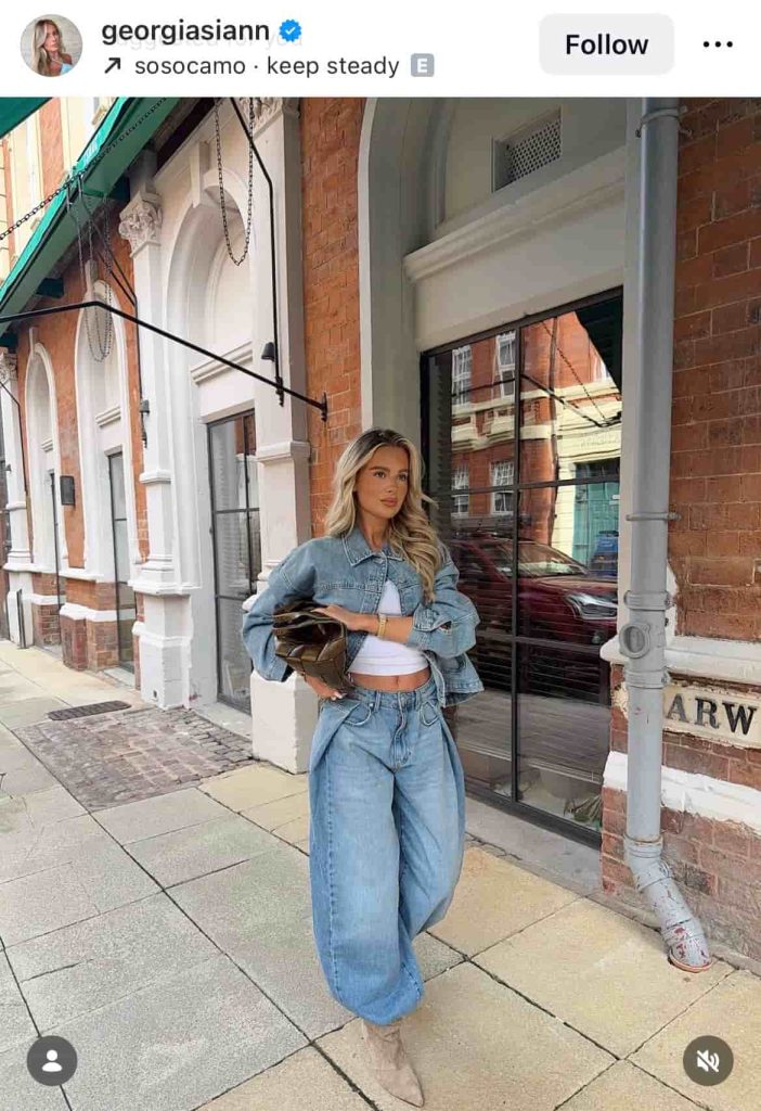 The oversized denim jacket with the slouchy jeans should not be this flattering, yet here we are—waist snatched, proportions perfect, and somehow still giving effortless.