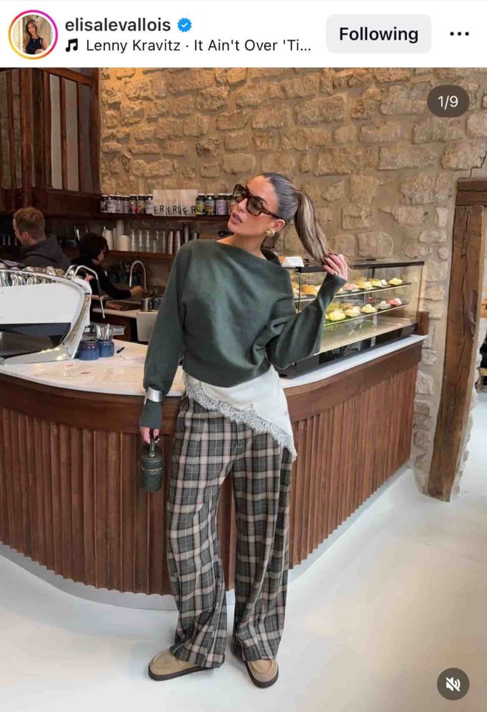 The deep green sweater is giving rich, moody, and slightly mysterious, while those plaid trousers are like—oh, she has taste and range.