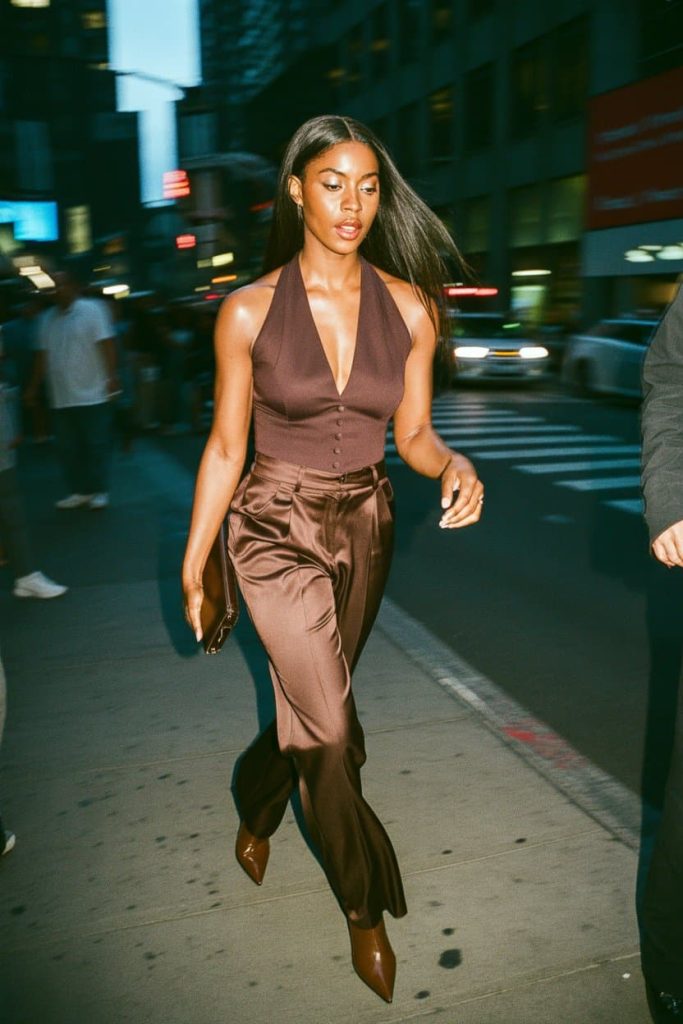 The deep chocolate halter top is serving confidence, collarbones out, shoulders back, no notes. Paired with those silky, tailored trousers, it’s giving grown, polished, and very much unbothered. The monochrome brown moment feels rich, intentional, and quietly sexy—like you didn’t dress to impress, you dressed because this is simply how you show up. Add the pointed heels and sleek clutch, and suddenly the sidewalk becomes your runway. This is the kind of outfit that turns heads without asking for permission.