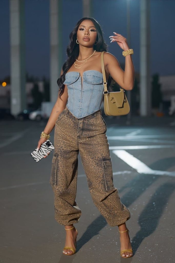 When mixing statement pieces like denim corsets and leopard cargos, keep your color story tight. Gold accessories and a neutral bag pull everything together, while heels (instead of sneakers) instantly upgrade the look from casual to boss-level night-out energy.