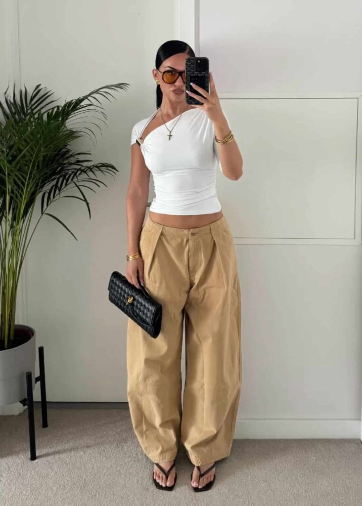 The volume on the pants gives effortless cool, but grounding it with a sleek flip-flop and structured clutch keeps it intentional, not lazy.