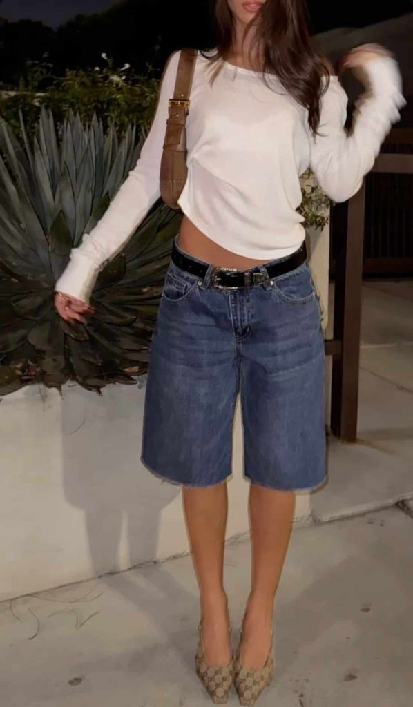 Those longer denim shorts are very “editor in Paris,” but elevating them with a sharp pointed heel is what takes this from casual to quietly expensive—keep the shoe sleek and neutral to elongate the leg.