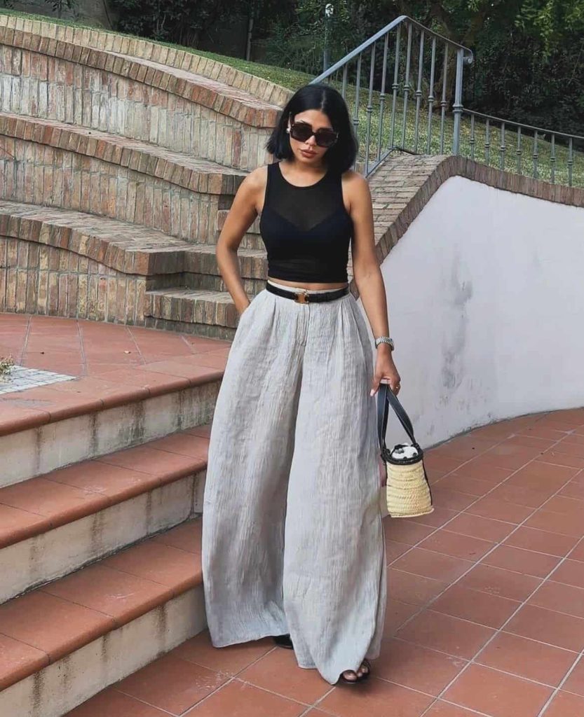 The wide-leg linen pants are doing all the work, so keep that waist defined with a slim belt and let the fabric move—effortless, but intentional.