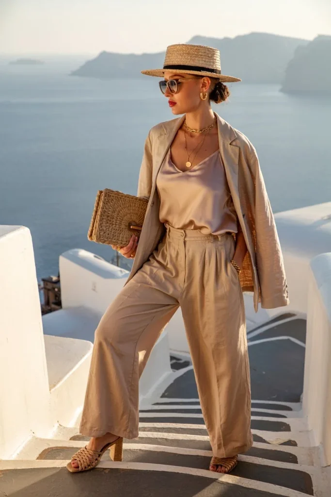 It’s paired with high-waisted pleated linen trousers in a soft neutral tone, perfectly cuffed for that “just strolling through Positano” vibe.
