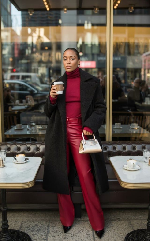 This outfit screams “I take my coffee bold, my meetings brief, and my exes blocked.” The rich burgundy-on-burgundy combo is pure power dressing with a side of “main character at a Paris café” energy. Those leather pants? They’re not just pants—they’re a personality. And that oversized black coat casually draped over her shoulders says, “Yes, I’m warm and unbothered.” The metallic mini bag adds just enough drama to make it clear she’s not here to blend in—she’s here to be seen.