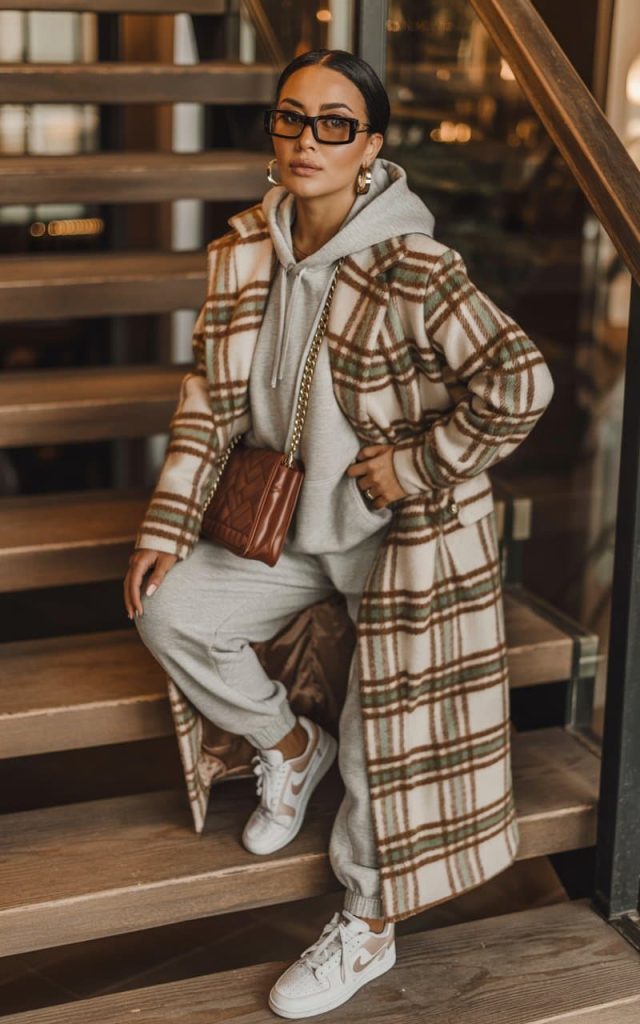 She’s giving “CEO of cozy, but make it editorial.” That plaid coat says, “I brunch in cashmere,” while the gray sweats whisper, “I value my peace.” The mix of structure and slouch is lethal — she’s comfy, but still serving “caught by Vogue” energy. The oversized frames add attitude, the gold hoops add drama, and that quilted crossbody bag with the chain strap? That’s the exclamation point on this fashion sentence.