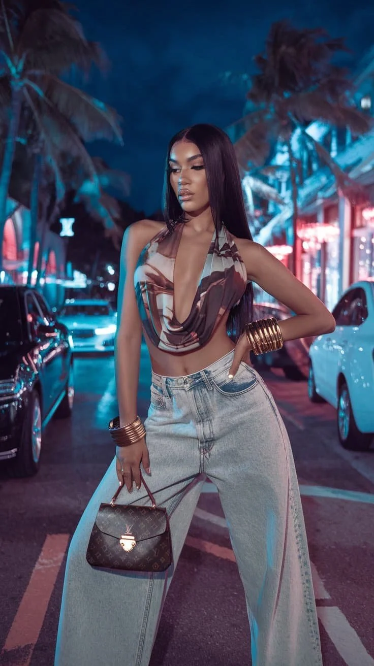 This outfit screams 2000s main character energy and we’re obsessed. From the cheetah-print halter top to the studded belt and flared low-rise jeans, it’s giving pure McBling meets street-style slay. Add the layered gold jewelry, oversized sunglasses, and red retro sneakers for a full-on Y2K fashion revival that would make Paris Hilton and Destiny’s Child proud. Whether you’re hitting the city or throwing it back on Insta, this look is all about confidence, curves, and that IDGAF but make it chic attitude.