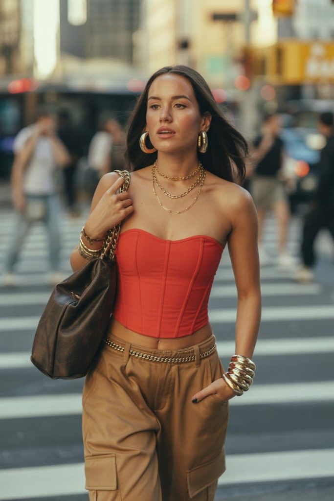This outfit is giving bold, confident, and unapologetically Y2K in the best way. The red corset top instantly pulls focus and creates that snatched, sculpted silhouette, while the relaxed tan cargo pants keep the look grounded and effortlessly street. The gold chain belt detail, stacked bangles, oversized hoops, and that big slouchy shoulder bag make it feel rich, styled, and just a little dramatic — like she stepped out knowing she’d turn heads. It’s the perfect mix of glam and edge that feels straight out of an early-2000s city scene.