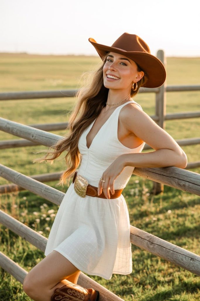 That flirty white sundress is doing all the work—light, feminine, and just structured enough to show off the waist—while the oversized western belt brings the attitude and pulls the whole outfit into cowgirl territory.
