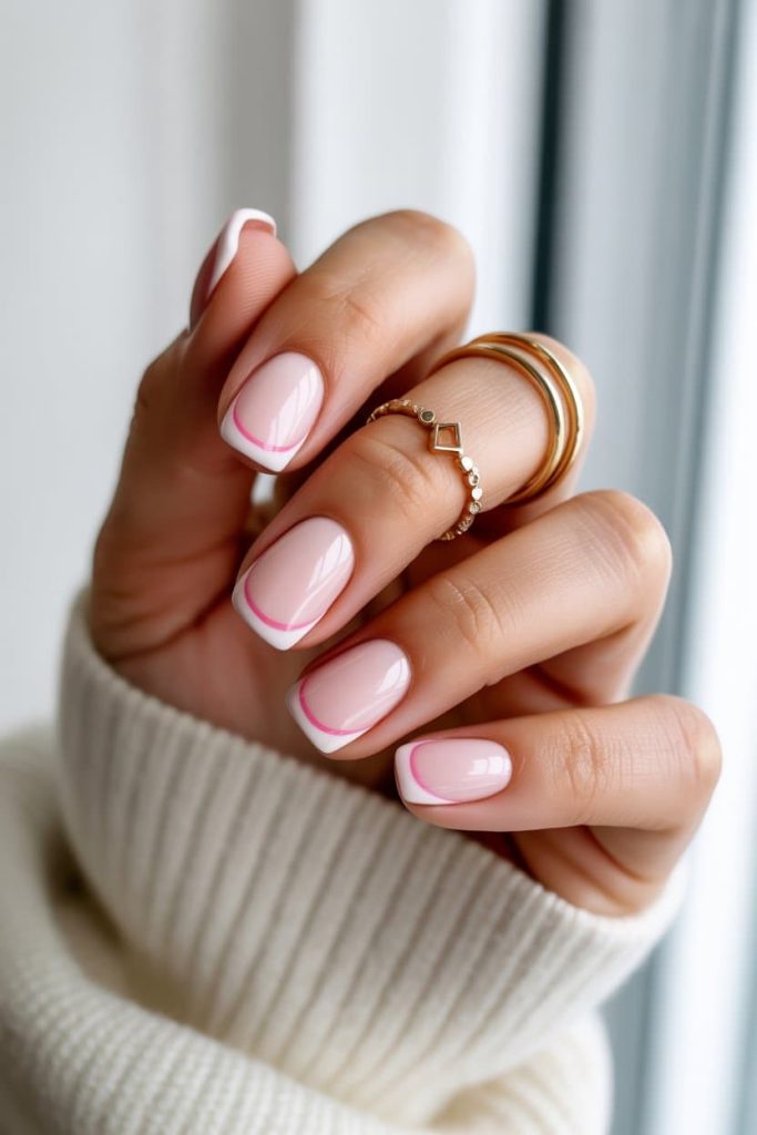 This manicure is giving French tip, but make it flirty. The classic white edge keeps things clean and timeless, while that soft pink inner line adds the perfect hint of personality — like a wink you didn’t mean to send but totally owned. To get that dreamy sheer base, reach for shades like OPI Bubble Bath, Essie Mademoiselle, or DND Pink Whisper to nail that effortless feminine glow. For the crisp white tip, go in with OPI Alpine Snow or Gelish Arctic White, then add the playful pink detail using OPI Suzi Nails New Orleans, Essie Fiji, or DND Peony. Finish it off with a glossy top coat like Seche Vite for that glass-shine effect. It’s cute, it’s classy, and it looks like the kind of manicure that gets compliments every time you reach for your latte.