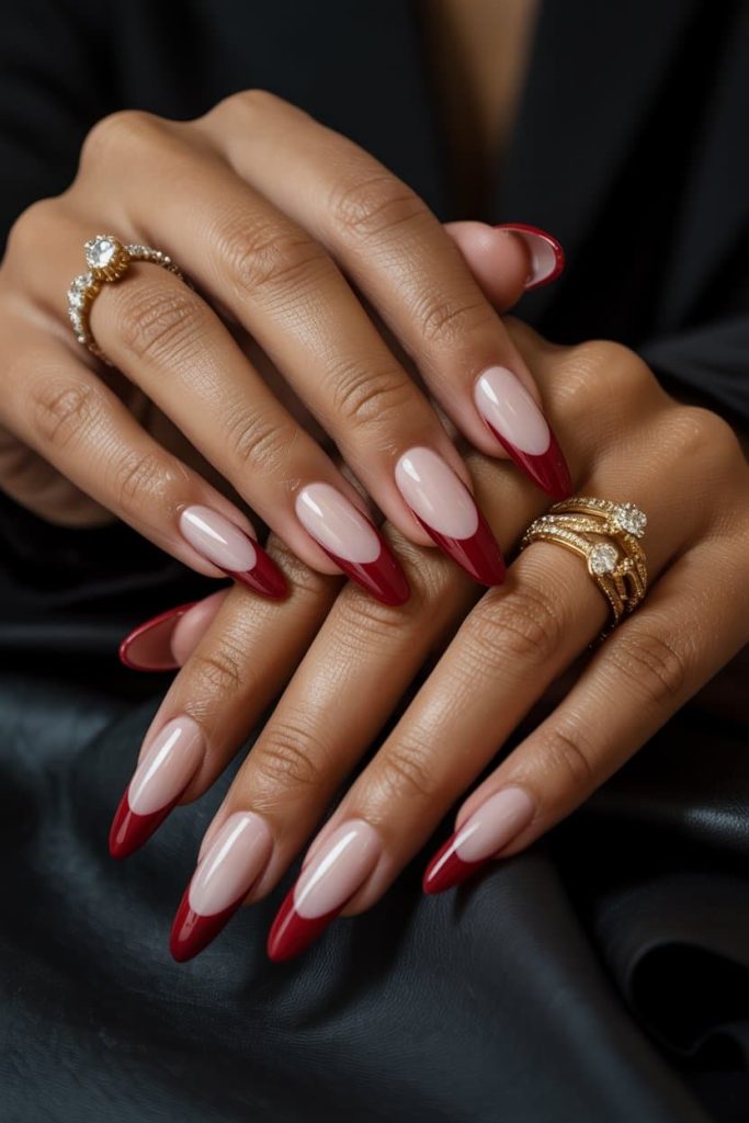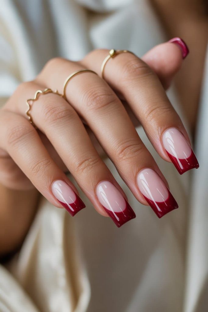 If you want nails that whisper luxury but still hit with that “don’t play with me” energy, this deep cherry French tip moment is the entire vibe. It’s classic, rich, a little dangerous, and absolutely perfect for anyone who wants their hands to look like they belong around a champagne glass… or someone’s heart. The glossy sheer-pink base gives your nails that clean-girl softness, while the sharp, square cherry tips add the drama — it’s giving Valentine’s Day villain meets quiet-luxury goddess. To recreate this exact look, ask your nail tech for a milky-nude base like OPI Bubble Bath, Luxio Nude 02, or The GelBottle Teddy, then top it with a deep cherry tip using shades like OPI “Got the Blues for Red,” DND “Dark Cherry,” or OPI “Malaga Wine” for that perfect red-wine richness. Finish it with a high-gloss gel top coat so your nails reflect light like they’re wearing diamonds. Basically? These nails don’t just complete an outfit — they become the outfit.