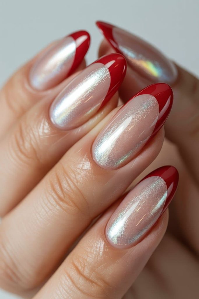 These red chrome French nails are giving rich-girl energy with a side of “don’t text me unless you’re obsessed.” The glossy fire-red tips instantly steal the show, but that icy pearl-chrome base? That’s the part whispering, I’m classy, but I bite. To recreate this exact luxe look, start with a sheer milky pink base like OPI Bubble Bath or The GelBottle “Petal”, then layer a subtle iridescent chrome powder — think Aurora Unicorn Chrome, Daily Charme Pearl Chrome, or Born Pretty Mermaid Powder — to get that soft holographic glow. For the tips, go full femme fatale with a crisp deep-red gel such as OPI “Big Apple Red,” Beetles Gel #510, or Madam Glam “Red Velvet.” Seal everything with a glass-shine top coat so the finish looks wet, expensive, and absolutely impossible to ignore. These nails don’t just say Valentine’s Day — they say main character year-round.