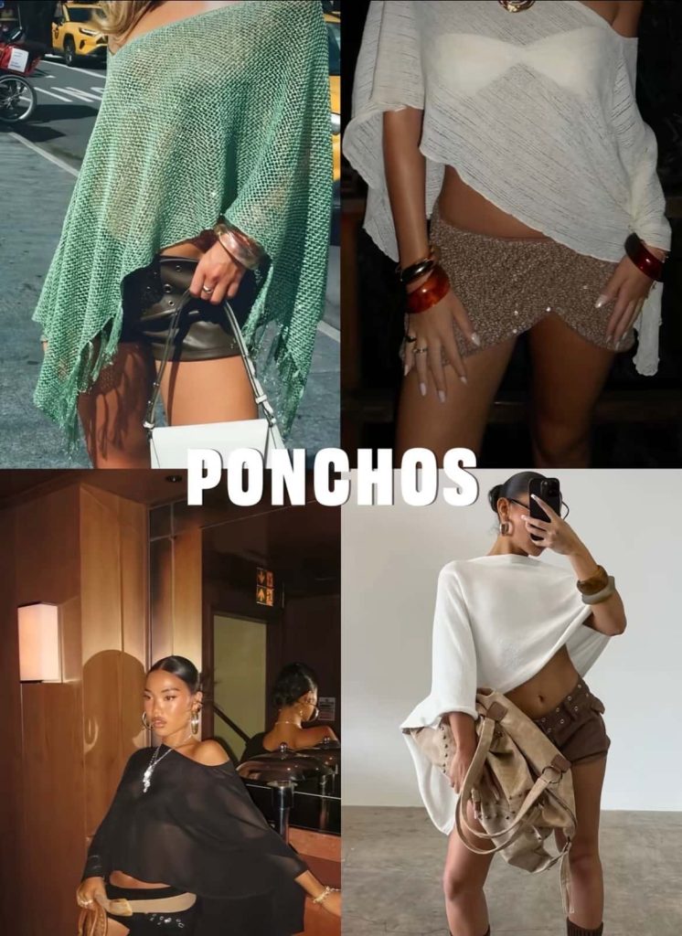 Lightweight ponchos are becoming that throw-on piece that instantly elevates a simple outfit. Worn off-the-shoulder or slightly slouched, they give that relaxed, model-off-duty vibe while still adding dimension.