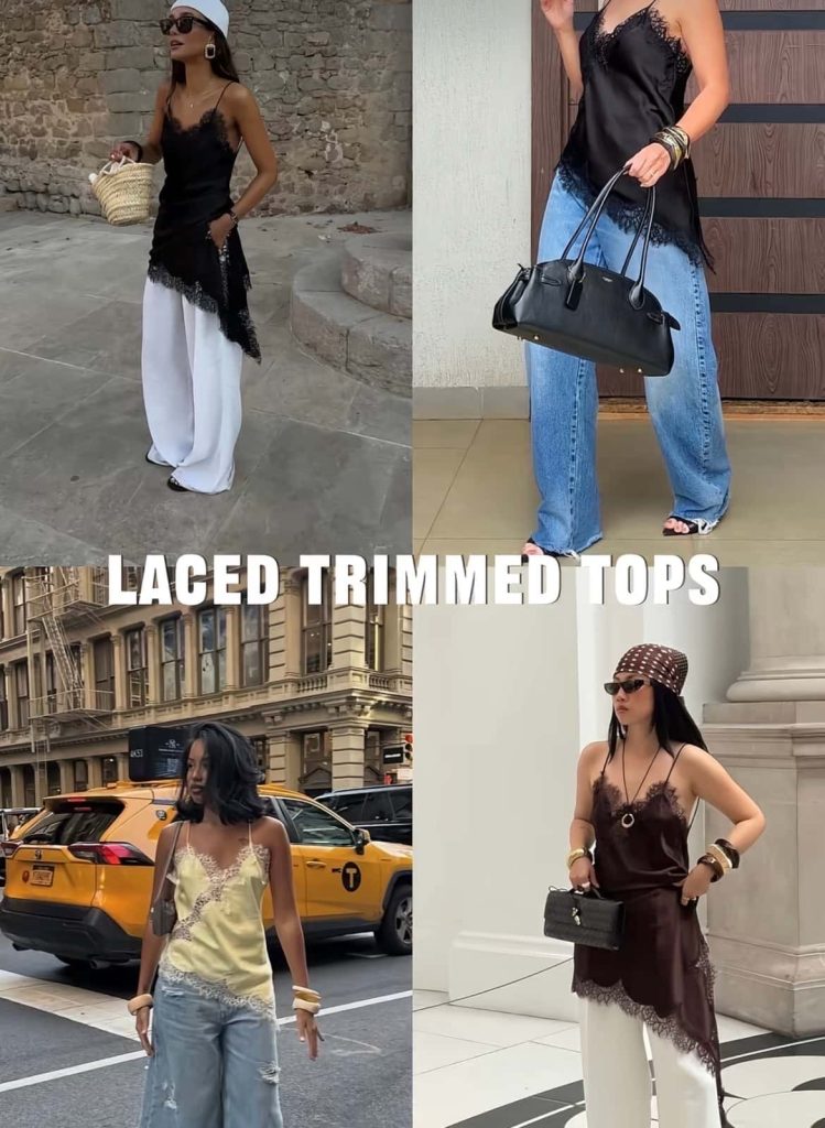 A lace-trim cami—slightly slinky, slightly undone—paired with baggy jeans or relaxed trousers is doing all the heavy lifting this season. It’s giving 90s minimalism, but styled in a way that feels current and intentional.