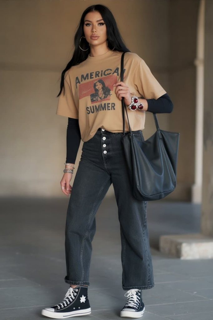 She’s serving vintage-tour-tee cool girl with a side of downtown attitude. The sand-tan graphic tee layered over a fitted black long sleeve is the ultimate 90s skater-grunge callback—slouchy on top, sleek underneath, and intentionally oversized so it looks curated, not careless. The washed black straight-leg jeans keep it grounded and soft, not overly distressed, giving the look a worn-in, lived-in, I’ve-been-at-record-stores-all-day vibe. Add the canvas high-tops and suddenly she’s main character in an indie film, walking through alley murals, humming The Clash.