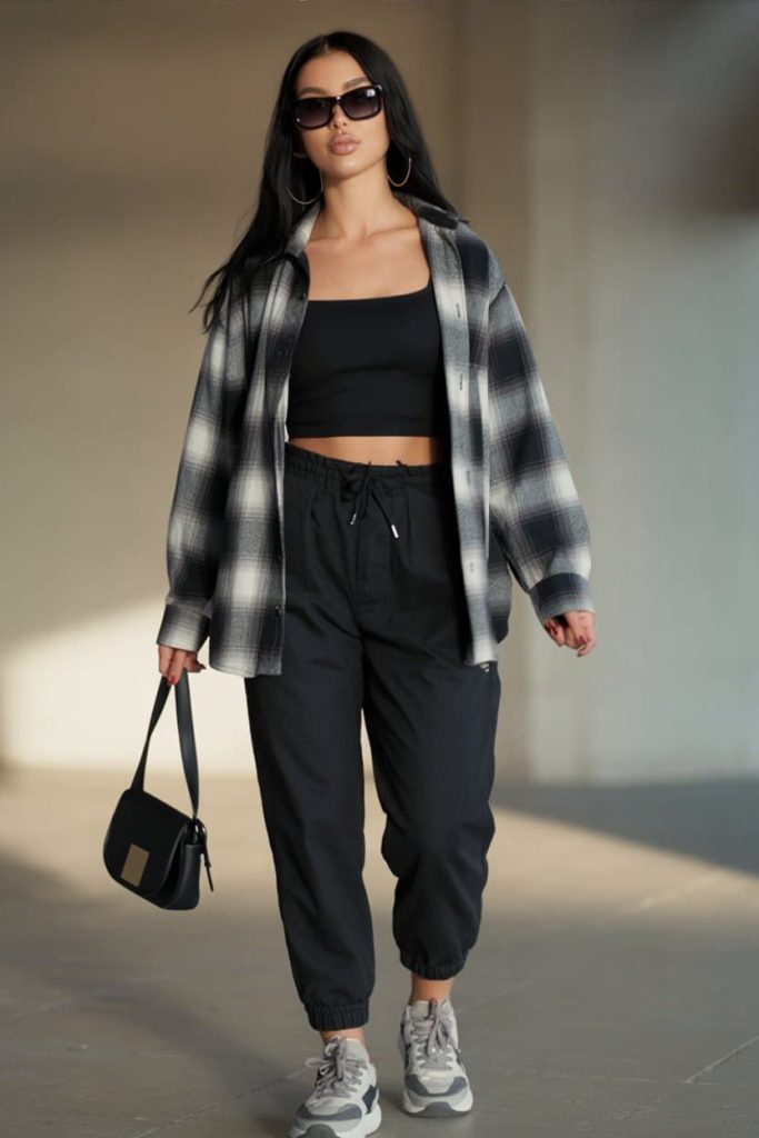 She’s giving “don’t bother me, I’m in my soft-grunge athleisure era” and honestly? It’s flawless. The charcoal plaid flannel is strategically oversized—not sloppy, just intentionally undone—balancing the clean, fitted black crop top underneath. The joggers sit relaxed but not saggy, cinched at the ankle so the silhouette stays sharp instead of street-bummy. And the chunky grey sneakers? Peak 90s grunge meets off-duty model energy.