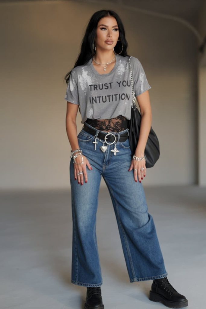 She understood the assignment: grunge, but make it poetic chaos with a side of lace. The distressed graphic tee tucked just enough to reveal a peek of black lace underlay is exactly the kind of rebellious layering that says, “I read tarot, thrift my tees, and will curse you with style if needed.” The wide-leg denim keeps it laid-back and 90s-coded, while the cross charm belt and stacked silver jewelry scream rock-altar chic. Heavy-soled combat boots ground the look, turning what could’ve been soft grunge into full “don’t test my energy” mode.