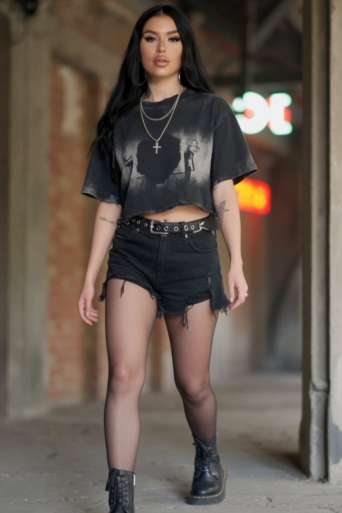 This is peak grunge girl energy: unbothered, black-clad, and probably listening to something louder than your comfort level. The bleached-out graphic crop tee looks like it’s survived exactly the right number of basement shows, and the shredded black shorts + sheer tights combo lands at that perfect sweet spot of messy but intentional. The grommet belt and combat boots aren’t just accessories—they’re attitude. She’s serving “soft chaos,” topped with stacked silver chains and hoops that catch just enough light while she pretends not to care who’s watching.