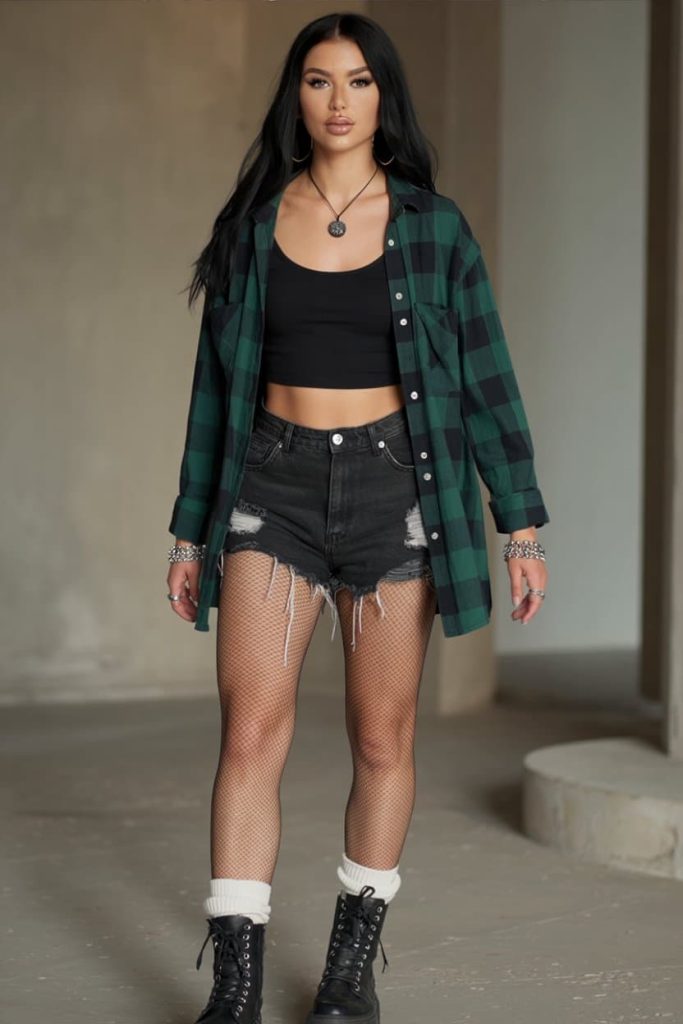 The oversized forest-green flannel draped over a fitted black crop top is classic grunge hierarchy: one piece slouchy, one piece tight, and both looking like she rolled out of a basement band rehearsal where she absolutely was the muse. The distressed black shorts + fishnets combo is pure 90s rebellion—strategically shredded, not sloppy—and the chunky lace-up boots with slouch socks? That’s the finishing move that says “I’ll slam dance, but I also have lip gloss in my pocket.”
