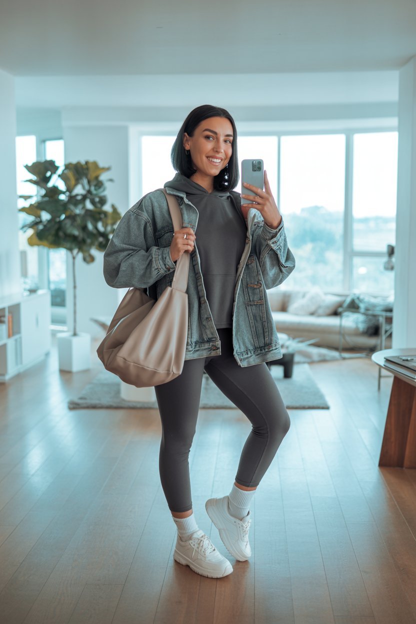 The sleek hoodie and matching leggings are giving comfy-core with contour, while that oversized denim jacket adds just the right amount of “I didn’t try, but I obviously slayed.”
