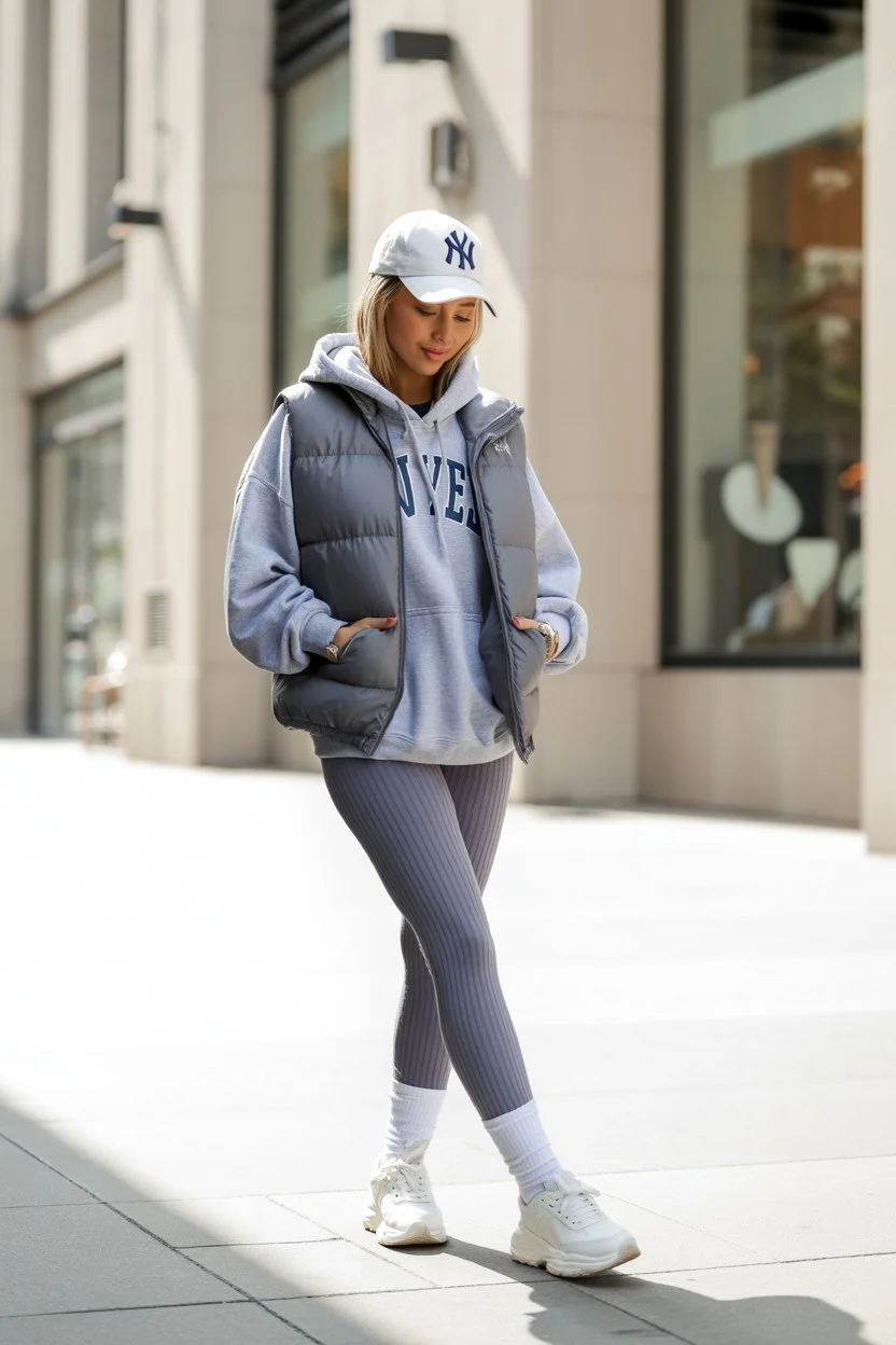 The oversized graphic hoodie, quilted puffer vest, and ribbed leggings are a masterclass in cozy layering with just enough effort to look effortlessly cool.