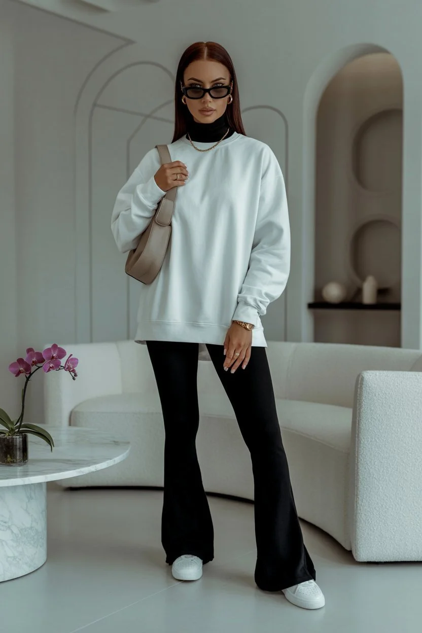 The oversized white sweatshirt layered over a sleek black turtleneck is the kind of fashion flex that says, “Yes, I’m comfy—but I also read Vogue before my morning coffee.”