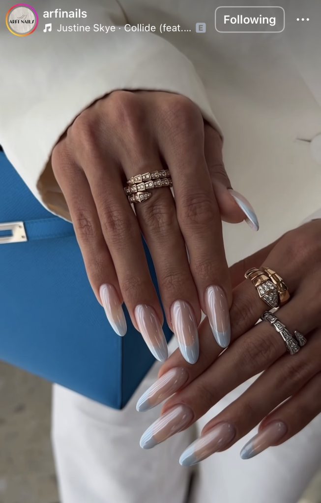 Light blue French tips with a glazed chrome finish are having a moment—and it’s easy to see why.