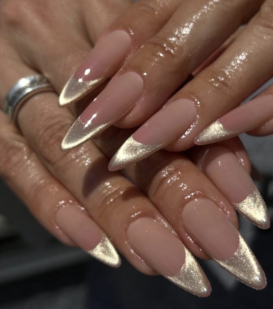 The soft nude base keeps things clean and minimal, while the gold chrome tips add that rich, glowing finish that instantly makes your nails look expensive.