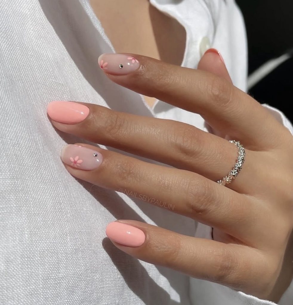 The glossy peachy base keeps things clean and fresh, while the tiny floral details add just the right amount of cute without overdoing it.