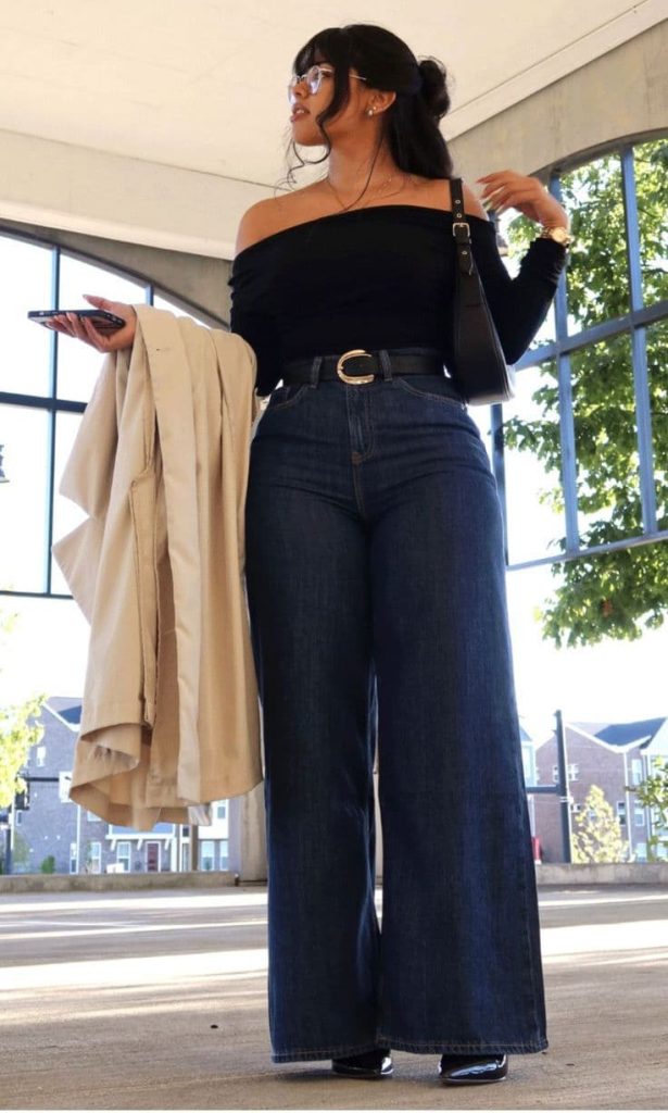 The off-the-shoulder top adds just enough flirtiness while the high-waisted wide-leg jeans keep the silhouette sleek, balanced, and seriously flattering.
