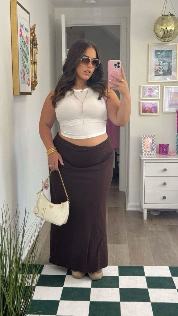 The fitted white tank keeps the look clean and flattering while the chocolate maxi skirt adds that sleek, elongated silhouette that always feels effortlessly chic.