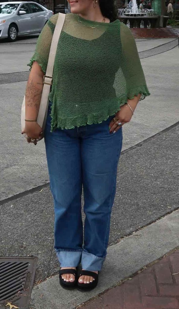 The airy green knit drapes beautifully over classic denim, creating that relaxed silhouette that’s comfortable but still stylish.