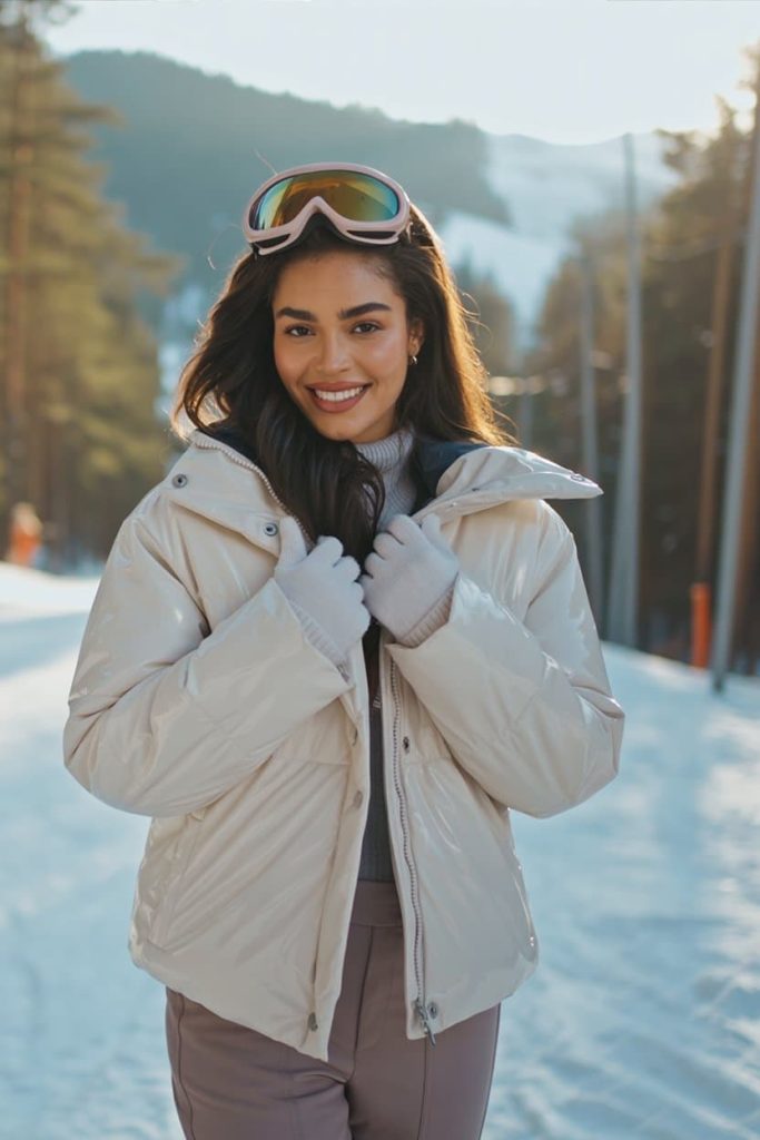 This look is giving Aspen, but she journals, hydrates, and refuses rental boots. The glossy cream puffer is the quiet-luxury flex everyone pretends not to notice, and those mauve-taupe ski pants? That’s how you say I ski, but I also brunch. The pastel goggles perched on top are the perfect “I’m not sweating, I’m posing” accessory—equal parts practical and influencer-coded. The knit gloves add softness, keeping the outfit in that dreamy cashmere-slope energy rather than “I borrowed my brother’s gear.”