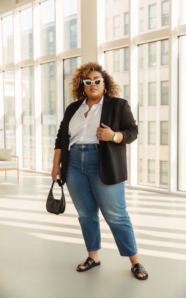 Serve-boardroom, steal-brunch—this fit does both without breaking a sweat. The crisp white button-down pops under a sharp black blazer, and those high-rise blue jeans snatch the waist while keeping the vibe casually executive (half-tuck the shirt for that “I run the meeting and the group chat” energy). White cat-eye sunnies and gold hoops bring retro-rich drama; match the metal with a chunky watch and a skinny chain so everything reads intentional, not accidental. Fisherman slides keep it cool-girl comfortable—swap for pointed pumps if HR emails “client visit” at 4:59 PM. Pro tip: belt in black to mirror the blazer, then finish with a mini top-handle bag for proportions that elongate the legs. Add a red-brown lip, a soft curl refresh, and a spritz of something expensive-adjacent; now you’re the dress code.