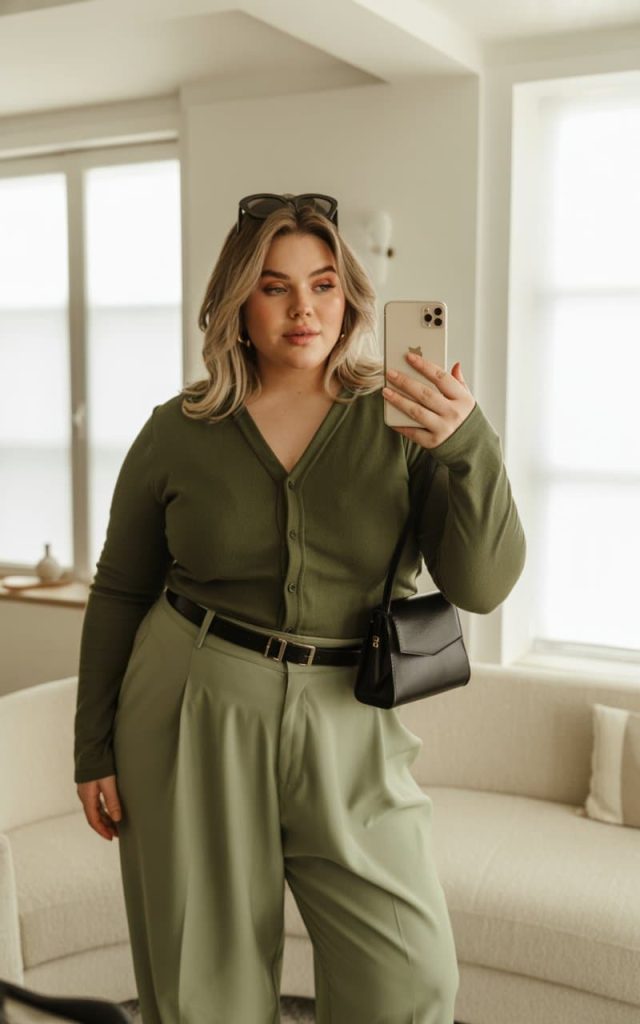Monochrome olive, but make it power-soft—this set whispers “VP of Vibes” while the pleated trousers do all the leg-lengthening PR. The V-neck cardi frames the collarbones (unbutton the top one for a subtle plunge), and that black belt is the quiet hero cinching everything into hourglass territory—match the hardware to your earrings so it looks intentional, not accidental. Keep the bag sleek and shoulder-hugged to highlight the waist; swap to a crossbody only if you’re commuting. For shoes, pointed-toe flats for desk-to-deli, block-heel mules for meetings, and loafers when you want rich-aunt energy. If you run warm, layer a satin cami underneath and cuff the sleeves; if you run cold, add a thin ribbed turtleneck in espresso for contrast. Final polish: rosy cream blush, glossy lip, and sunnies on top of the head—because yes, they’re an accessory and a personality trait.