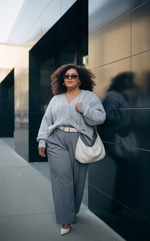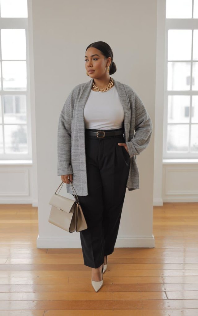I love this look because it’s the corporate version of “don’t play with me” energy—soft cardigan on the outside, boardroom baddie on the inside. The creamy tee keeps it clean, the tailored black trousers snatch the waist (hi, belt!), and the pointed pumps say, “emails answered, hearts broken.” Pro tip: push the sleeves of the gray knit up to the forearm to create shape, then front-tuck the tee for a crisp waistline. Keep your jewelry chunky up top (a bold chain + hoops) so the eye travels up to your face on Zoom, and match your bag and shoes in a light neutral to elongate the leg. If you run warm, swap the tee for a silky bodysuit; if you run late, add a red lip and call it “intentional.” Office-appropriate? Yes. Promotion-magnet? Also yes.