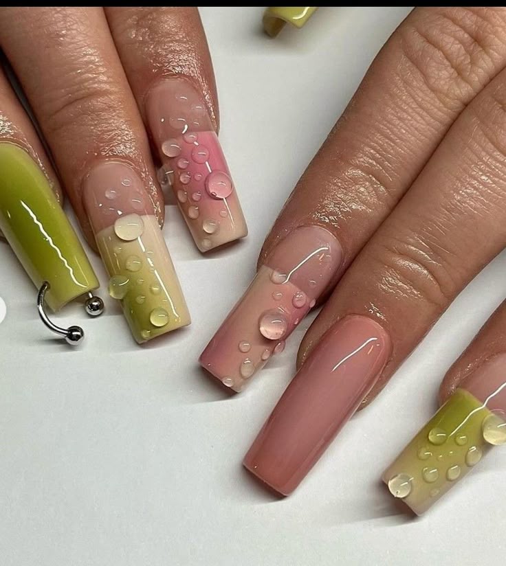 The glossy nude and lime gradient creates a fresh, almost citrusy vibe, while the raised gel “water drops” add texture that makes the whole manicure look like it’s literally glistening.