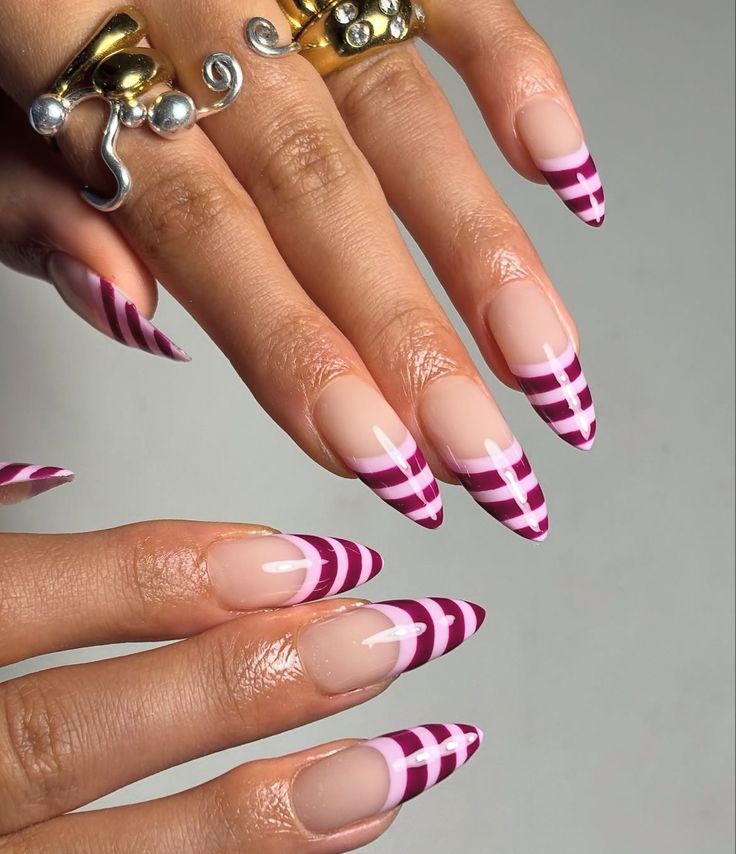 The deep raspberry and soft pink stripes stacked over the nude base create a bold graphic look that instantly draws the eye, especially on that sleek almond shape.