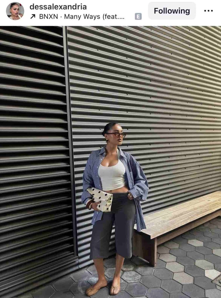 An effortless off-duty look that still reads polished, this outfit pairs a crisp striped button-down with a fitted white tank and tailored bermuda shorts for that perfect “model running errands in SoHo” vibe.