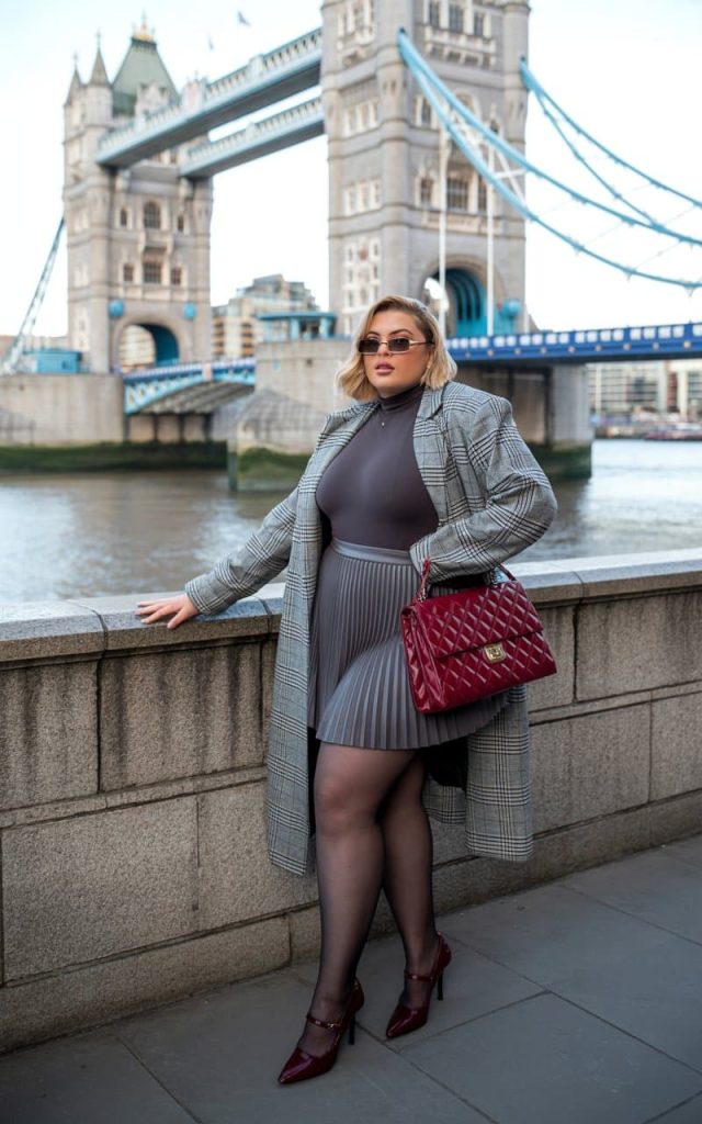 This London look is pure plus-size power chic. The grey plaid coat brings that “I have important places to be” energy, while the pleated skirt and turtleneck combo keep it sleek and structured. The deep red quilted bag and matching heels? Chef’s kiss. That pop of color turns a neutral palette into a statement.